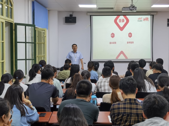 首先,王飞向同学们解读了近年来国考形势的变化,分析了历年国考考情,讲解了公务员考试的类型,尤其是选调生考试的相关情况,包括考试时间、题型题量、选拔方式、备考时间安排等,并结合水产专业的岗位需求及录取分数线情况,指导大家进行更有针对性的报考和备考。