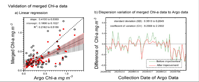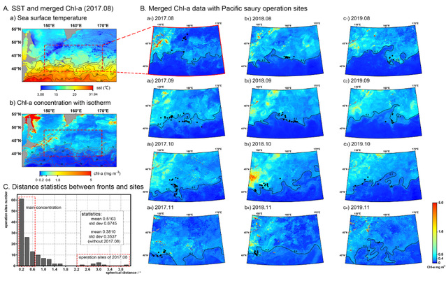 7月28日,国际遥感top期刊《RemoteSensing》在线刊登了中国海洋大学渔业海洋学实验室关于渔业遥感方面的最新研究成果“Improvement and Assessment of Ocean Color Algorithms in the Northwest Pacific Fishing Ground Using Himawari-8, MODIS-Aqua and VIIRS-SNPP”。该研究通过对三颗卫星的水色遥感数据算法在西北太平洋海域的表现进行区域性改进及后续评估,显著的改善了遥感叶绿素数据在西北太平洋区域的数据准确性以及覆盖率,进一步结合渔业作业点及海洋环境数据发现,叶绿素锋面同黑潮延伸体温度锋面以及秋刀鱼渔业作业点在空间上高度重合;同时,改进后的叶绿素数据对于中尺度涡旋以及ENSO气候具有更为灵敏的响应。因此,基于改进的遥感叶绿素产品,研究从海洋叶绿素时空变动角度,对西北太平洋渔场资源变动及气候和海洋学现象影响机制的研究有重要意义。