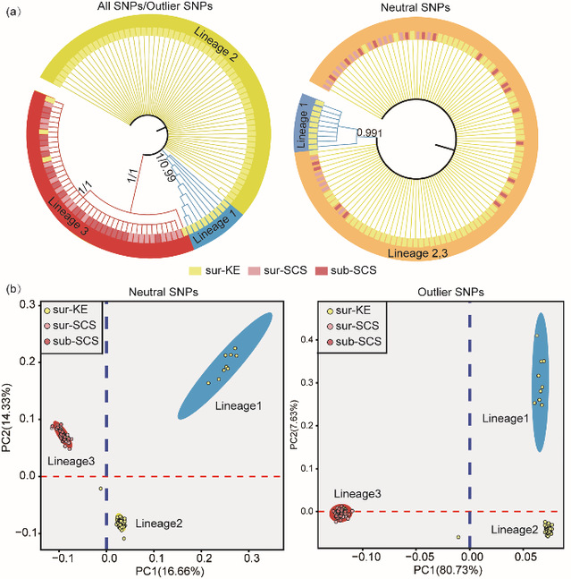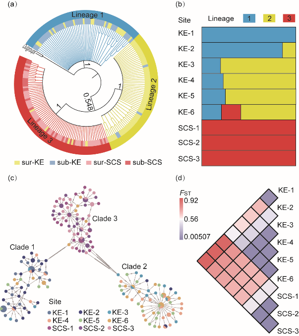 研究首先以线粒体COI基因作为分子标记,揭示了来自9个采样站点的鹅颈藤壶种群的遗传分化模式,接着利用GBS数据加以验证,然后结合采样点的温度数据筛选与温度相关的离散位点,并进行功能注释。研究结果表明,西北太平洋海域的鹅颈藤壶存在三个高度分化的谱系,其中两个谱系分别在黑潮延伸体海域的表层和次表层占主导地位,另外一个谱系则主要分布在南海,该遗传分化模式与环境温度呈现一致性。基于遗传距离估算的分化时间表明三个谱系的分化可追溯到上新世,然而,温度的异质性维持了如今我们所观察到的遗传格局。尤其是在黑潮延伸体海域不同水层存在的遗传分化的差异甚至大于相距千里的表层种群之间的遗传差异,表明小尺度的垂直方向上的热异质性也是维持远洋物种遗传分化模式的重要因素。