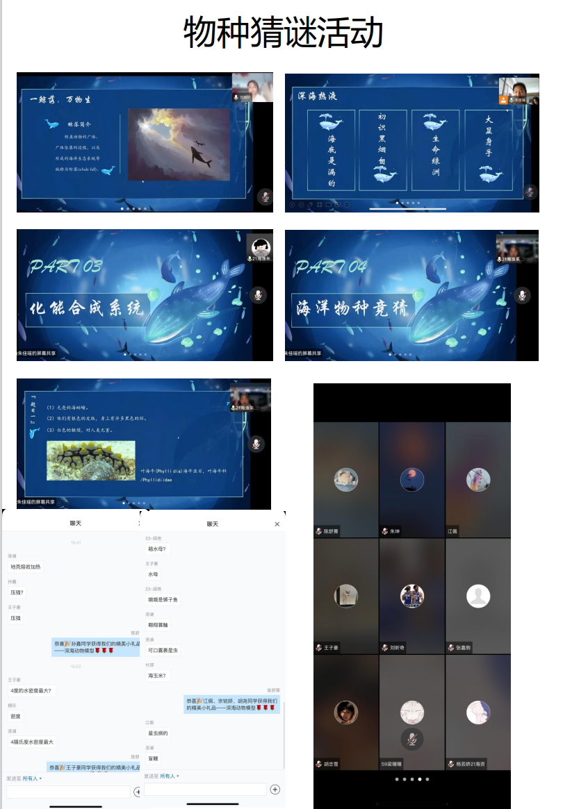 519日之前,进行物种猜谜活动准备,与水产学院2021级本科生班级相联合,进行线上活动宣传,召集同学前来参会。三位主讲人进行专题资料的收集整合与学习,进行内容的准备。519日晚630物种猜谜线上活动如期开展,来自各班的水产学子齐聚于此,共赴知识盛宴。首先三位主讲人分别介绍了鲸落、热液、冷泉,在介绍完三个海洋生态系统后就开始了激动人心的猜谜环节,各班同学积极竞答,展现出水产学子丰厚的专业知识储备。线上活动结束后,总结活动,制作推送,送出礼物。