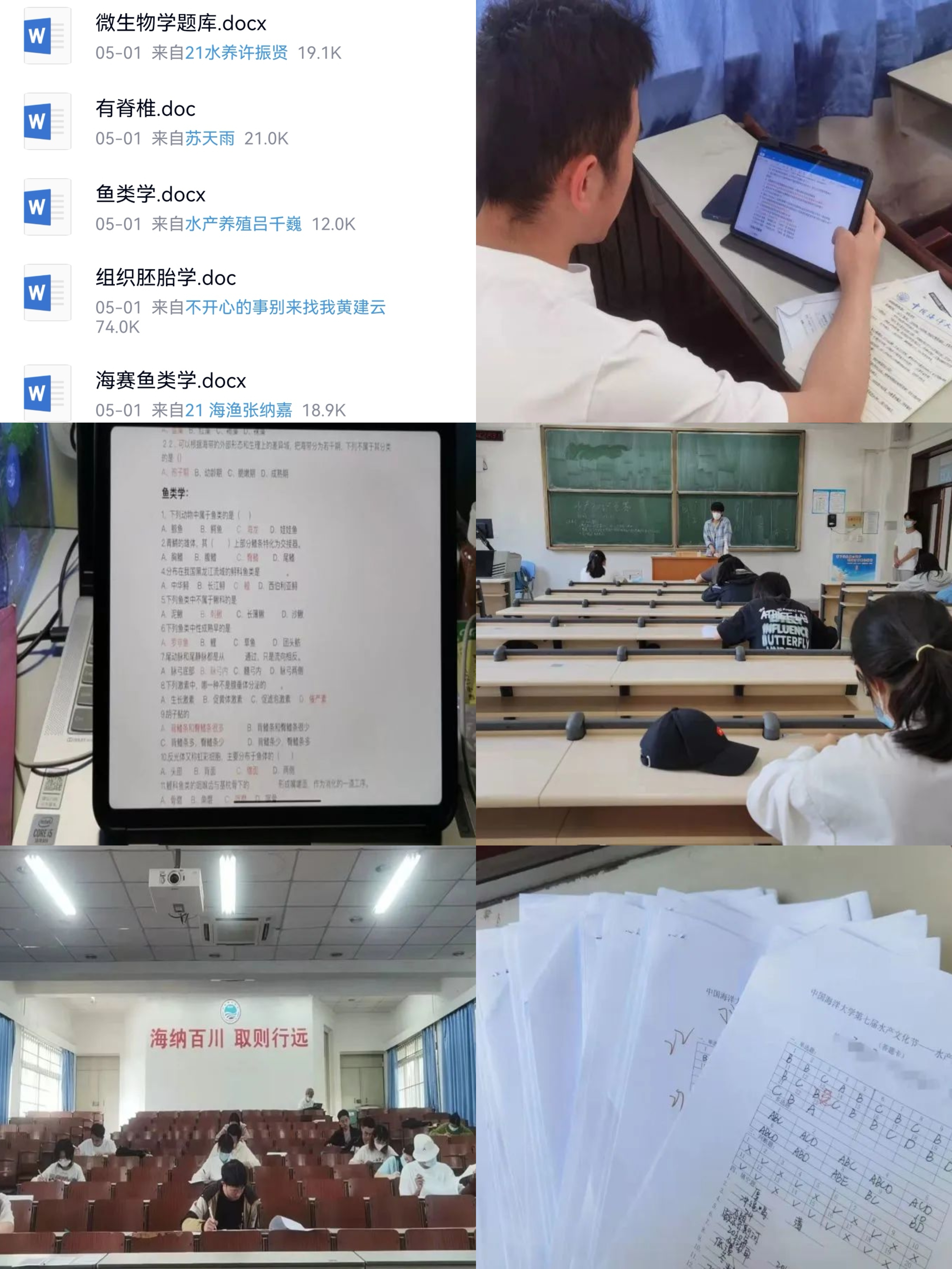 425日至512日期间开展“水”与争锋——水产常识挑战赛,整理、制作并完善了涵盖微生物学,普通动物学,鱼类学,组织胚胎学,细胞生物学,植物学,海洋时政,海洋地质学等知识的8个题库。512日至514日期间,完成制作并修正了两套竞赛试题。521日下午200-3:00“水”与争锋——水产常识挑战赛于鱼山校区和崂山校区同步开展,每个考场均有两位监考员负责监考,试后当日完成评卷与订正工作。排名依据分数由高到低的顺序,分数相同者交卷时间较早的排名靠前,交卷时间精确至秒。最终产生出一等奖1名、二等奖2名、三等奖3名以及优秀奖4名,并与523日发布推送公布最终结果。