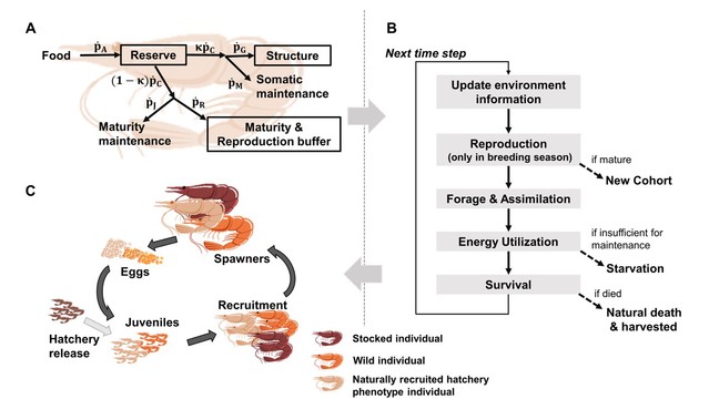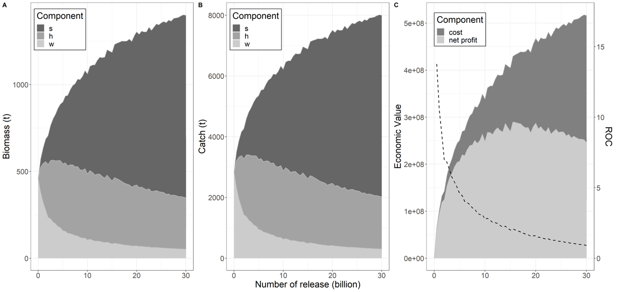 本研究开发了一个基于动态能量收支理论的基于个体的模型(DEB-IBM),以理解增殖种群动态和密度制约机制,将其应用于典型增殖物种中国对虾(Fenneropenaeus chinensis)以证明该模型框架的效用,模型预测符合实际观测的种群生物量和产量轨迹。针对资源增殖的多重效应,本研究阐明了由于密度制约效应,生物量和产量的增加随放流规模的增加而受到抑制,以及生态和经济目标之间的权衡,即追求高经济效益可能会在没有适当管理的情况下损害野生种群。此外,本研究揭示了结合资源增殖和捕捞控制在促进种群恢复和维持产量方面的潜力,并强调了理解资源增殖中密度制约效应的重要性,并提出了评估资源增殖种群动态的方法,在制定增殖管理策略方面具有巨大潜力。该方法可作为评估资源增殖动力学的一般性方法,为增殖渔业的管理提供参考依据,对于我国海洋牧场的合理规划和科学建设具有重要的应用价值。
