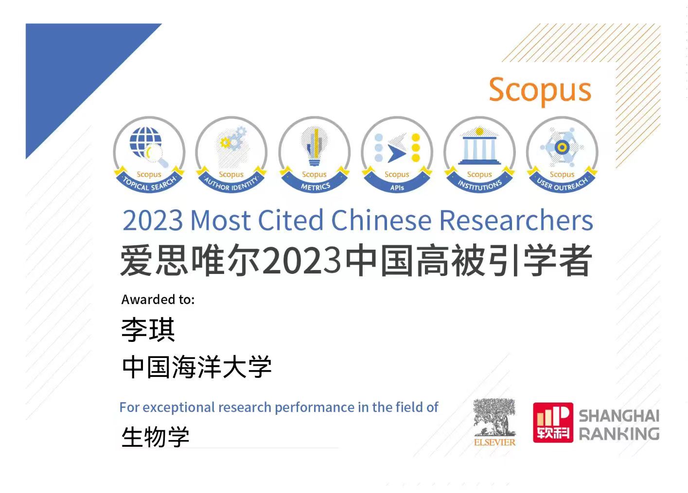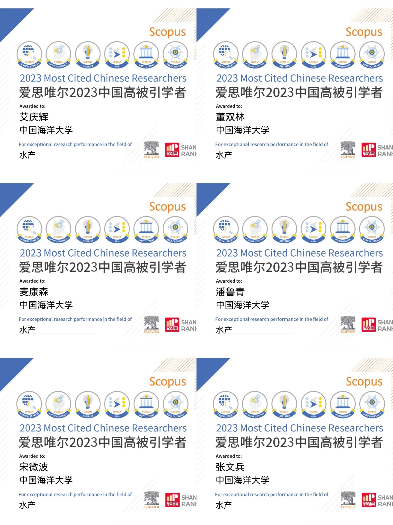 近日,全球性信息分析公司爱思唯尔(Elsevier)正式发布了2023“中国高被引学者”(Highly Cited Chinese Researchers)榜单,共有5801人上榜。他们来自496所高校、企业及科研机构,覆盖了教育部10个学科领域、84个一级学科。在本年度榜单中,中国海洋大学上榜23席位,其中水产学院占据7席位,艾庆辉、董双林、麦康森、潘鲁青、宋微波、张文兵(按姓氏拼音首字母排序)6位教授入选水产高被引学者,李琪教授入选生物学高被引学者。