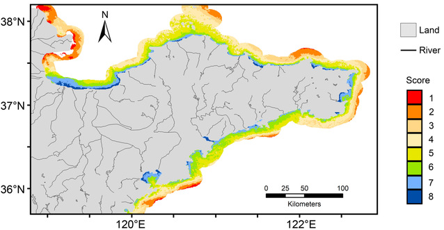图3 市场导向的山东牡蛎养殖选址模型适宜性分布图