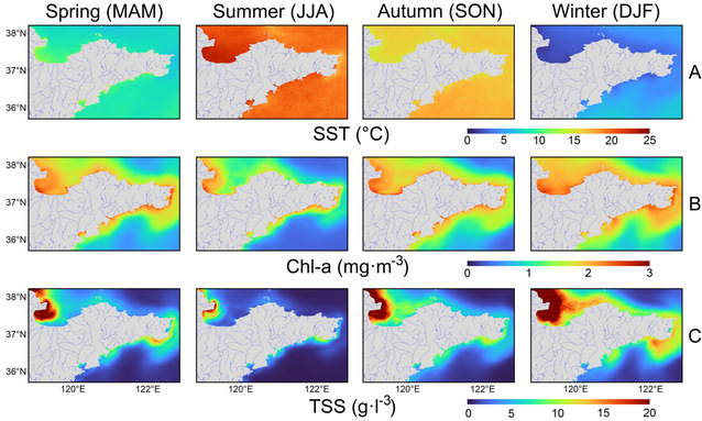 图2 山东近海四季海水表面温度(SST)、叶绿素a浓度(Chl-a)和悬浮颗粒物浓度(TSS)分布图