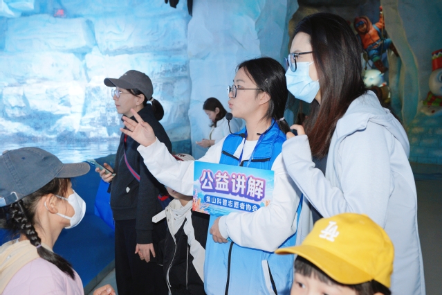 在海洋生物科普活动现场,鱼山科普志愿者协会的志愿者们热情地向游客们介绍着神奇的海洋生物们。他们先后带领游客们来到了海豚表演区、白鲸展区、海狮展区和企鹅展区,详细讲解了这些海洋生物的生理结构、生活习性以及与人类的关系。从海豚的分布范围、到白鲸高超的口技能力,再到企鹅在极地环境中的生存策略,游客们听得津津有味,对这些海洋生物产生了浓厚的兴趣,纷纷驻足观看,拍照留念。