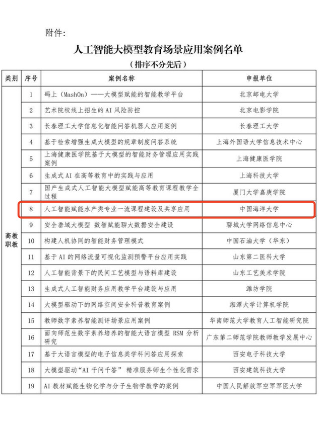 近日,中国教育信息化网发布了《关于公布人工智能大模型教育场景应用案例的通知》,中国海洋大学推荐的“人工智能赋能水产类专业一流课程建设及共享应用”案例成功入选。