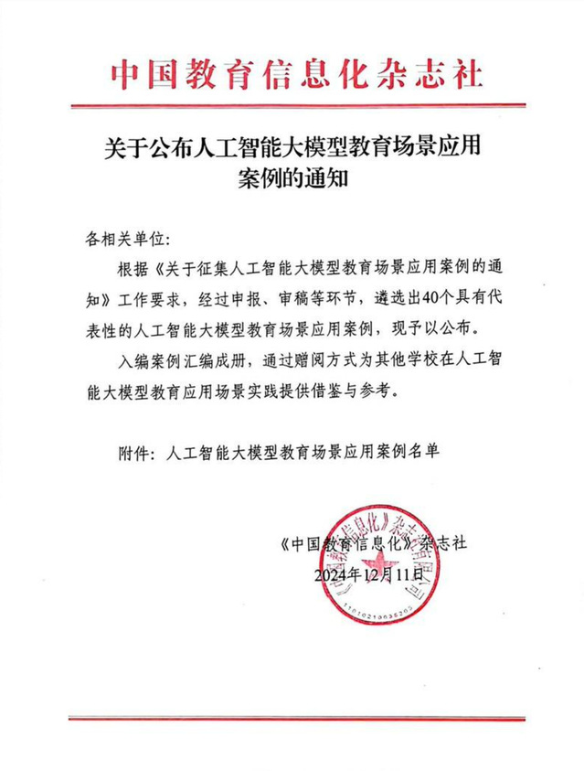 本次活动由教育部教育管理信息中心主管的《中国教育信息化》杂志社发起,旨在推动教育信息化的发展和应用,促进教育教学的创新和提升。经过征集、申报、评审等环节,在全国共遴选出40个具有代表性的人工智能大模型教育场景应用案例,入编案例将汇编成册,为其他学校在人工智能大模型教育应用场景实践提供借鉴与参考。