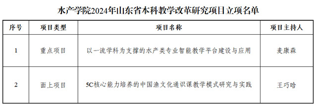 近日,山东省教育厅公布了2024年度本科教学改革研究项目立项名单,水产学院推荐的两个教研项目获批立项,充分彰显了学院在推动本科教育教学改革,全面提升人才培养质量方面的卓越成效。