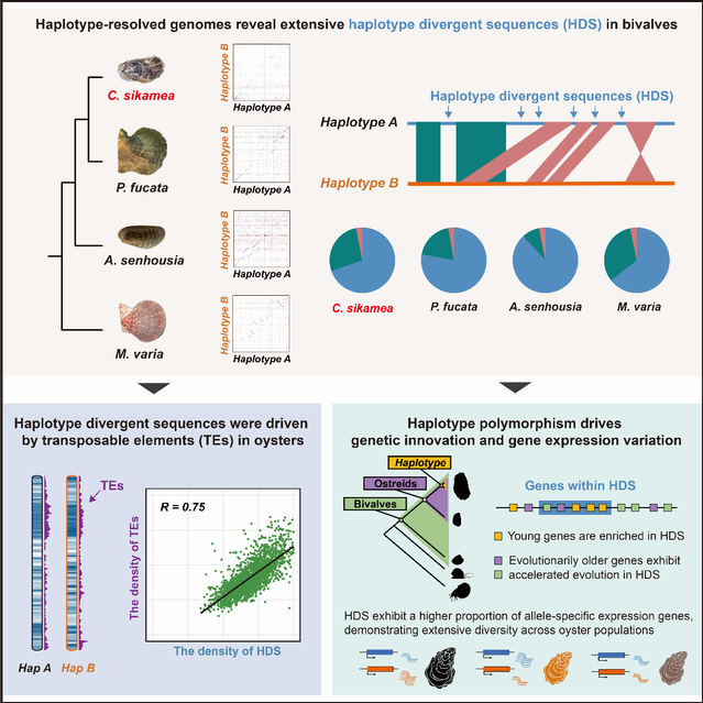 近日,水产学院贝类遗传育种团队李琪教授、刘士凯教授联合英国爱丁堡大学合作者在双壳贝类基因组多样性研究领域取得重要进展。相关成果以“Haplotype-resolved genomes provide insights into the origins and functional significance of genome diversity in bivalves(单倍型解析基因组揭示双壳贝类基因组多样性的起源与功能意义)”为题,在Cell Reports期刊上在线发表(//doi.org/10.1016/j.celrep.2025.115697)。