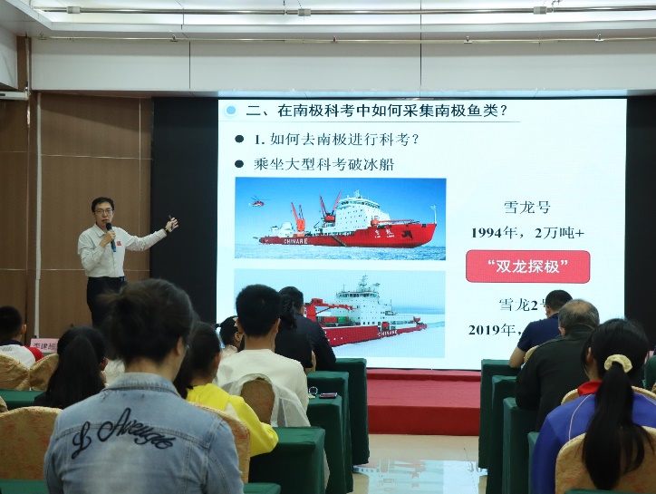 开幕式后,五场精彩的科普讲座依次展开。李建超副教授以《你好,南极鱼类》为题,带领听众走进神秘的南极海域;侯志帅教授在《鱼类性格与行为研究探秘》中,生动解析了鱼类的“个性”与生存智慧;王欣欣副教授通过《“海底建筑师”——人工鱼礁如何构筑海洋牧场生态家园》,展示了人类如何助力海洋生态修复;李惠茹副教授的《走近水生生态系统——PBL项目式学习》以实践案例启发青少年科学思维;胡志博士则在《生物的适应艺术:揭秘潮间带的多样性》中,揭示了潮间带生物的顽强生命力。授课同时,老师们与青少年听众积极互动,不时传出惊叹声、掌声和笑声。