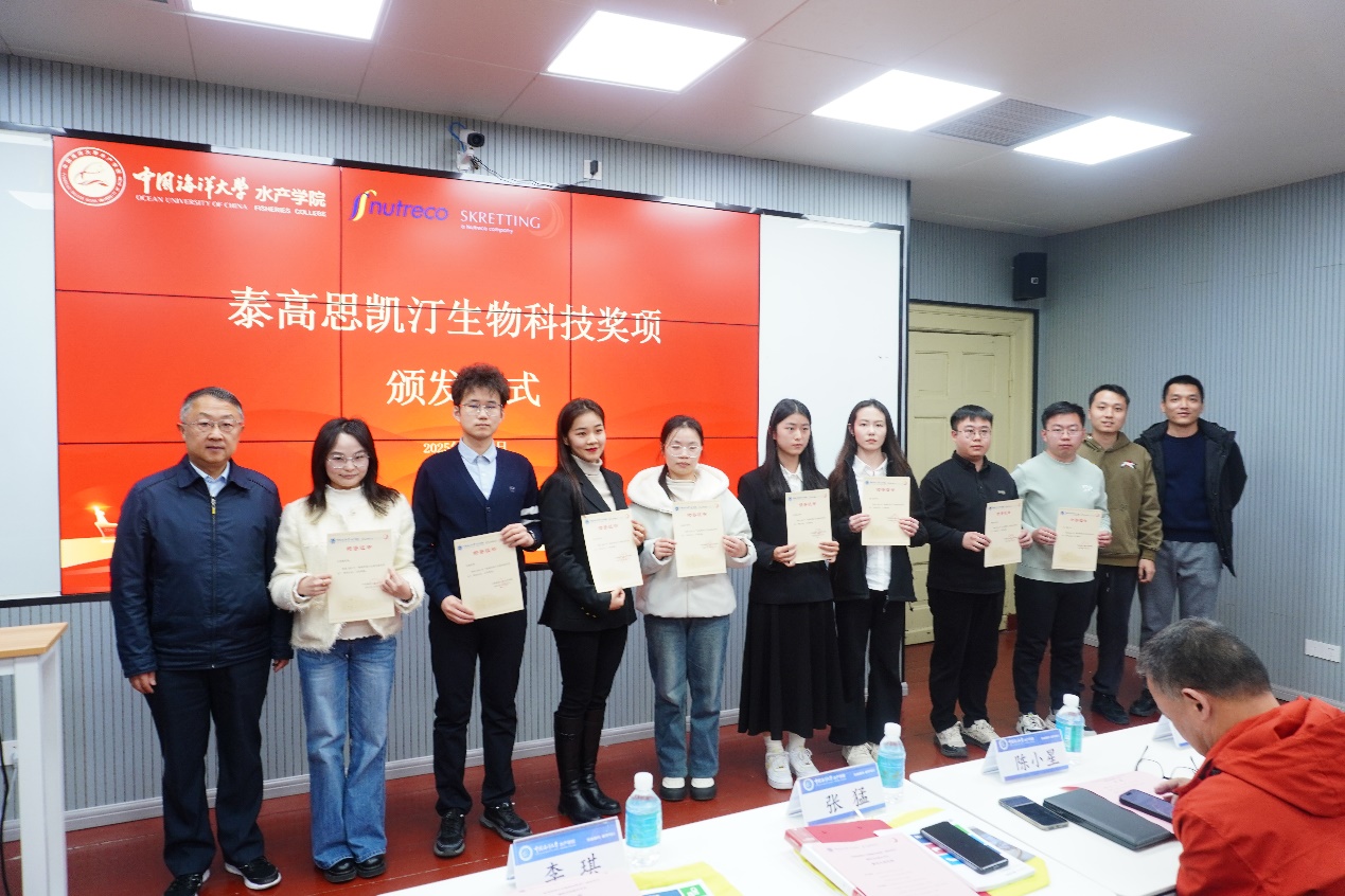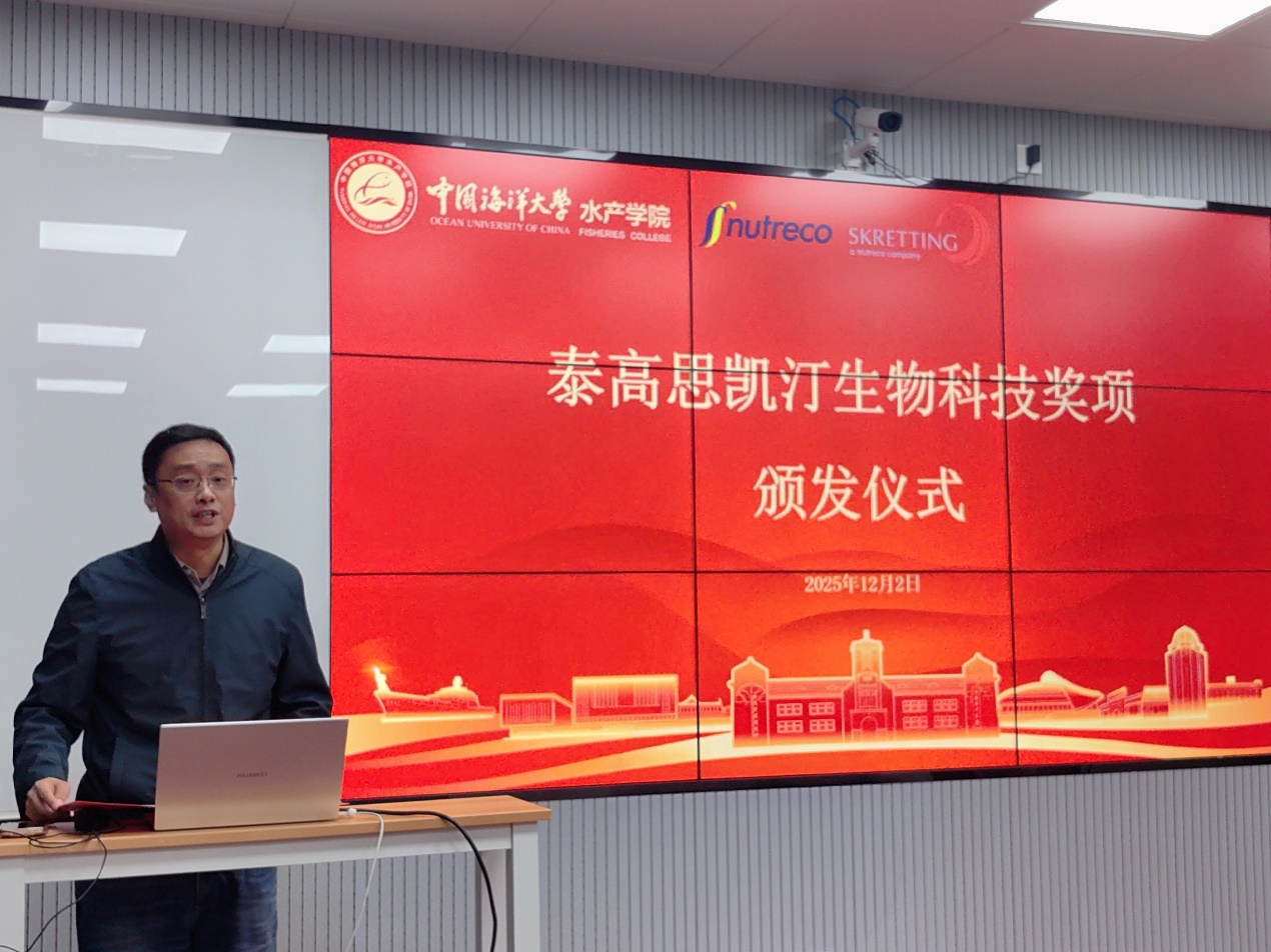 12月2日,“泰高思凯汀生物科技奖项”颁发仪式暨校友经验分享会在鱼山校区铭史楼302会议室举行。泰高思凯汀销售总监陈小星,水产学院党委书记张猛、名誉院长李琪、副院长万敏出席仪式。