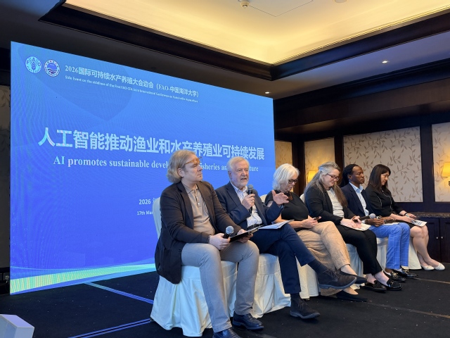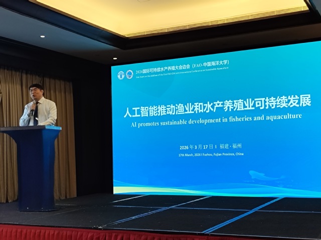 3月17日至20日,由中国渔业协会和联合国粮食及农业组织(FAO)共同主办的“2026国际可持续水产养殖大会”在福建福州举行。中国海洋大学水产学院深度参与大会筹备与组织工作,并于3月17日与联合国粮食及农业组织联合举办“人工智能推动渔业和水产养殖业可持续发展”专题边会。学校副校长刘勇出席相关活动并致辞。学院院长艾庆辉主持本次边会。