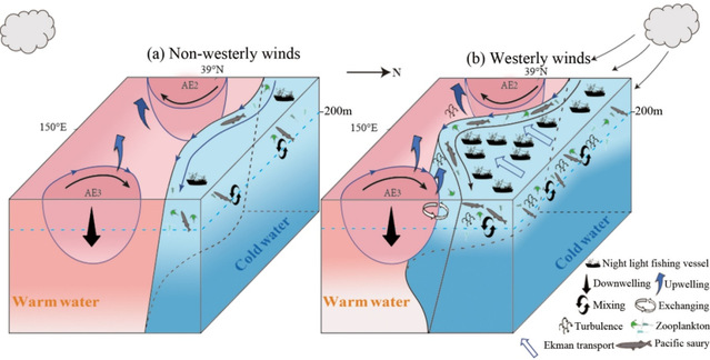 在与物理海洋学教育部重点实验室陈朝晖教授的合作研究中,团队利用潜标长期连续观测网络,并结合遥感与渔业数据,成功解析了2016年西北太平洋秋刀鱼渔场异常南移事件的机理。研究指出,亲潮冷水与中尺度暖涡相互作用形成了渔场空间基本格局,而天气尺度的西风事件则通过埃克曼输送诱导亚中尺度上升流,提升水体垂向混合和饵料集聚,驱动秋刀鱼日间分布动态的短期变化。2022级博士研究生张玉磊与崂山实验室博士后朱瑞琛为文章共同第一作者,这是我校水产与海洋双一流学科协同攻关的标志性成果之一,凸显潜标立体观测技术及其与生态机制结合的科学力量,为远洋渔场环境立体检测示范应用提供全新实证与模式参考。