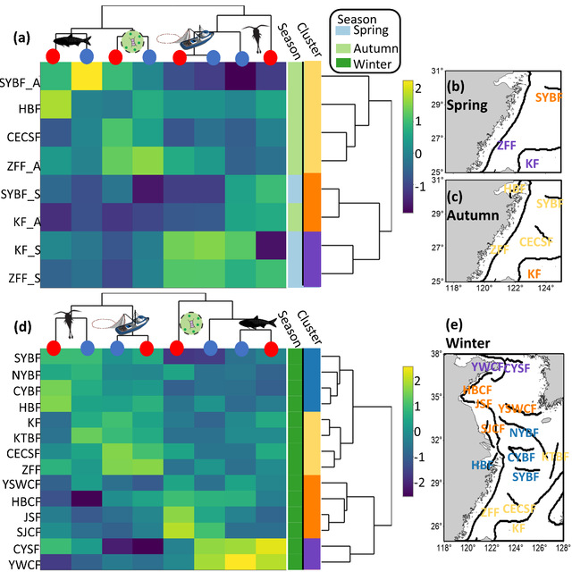 研究运用多频走航声学探测、水下视频、高分辨率卫星遥感及AIS渔业活动数据等新技术方法,成功构建三维观测分析框架,系统刻画东海陆架区中尺度锋面对浮游植物、浮游动物、鱼类及捕捞活动等多营养级影响的时空异质性。研究发现锋面生态效应存在显著的营养级空间解耦现象,不同季节、冷暖水侧、表层-底层及昼夜时段均呈现出生物动态聚集的复杂模式,突破了传统二维锋面研究的局限。这项工作凸显了多学科和新技术集成在阐明关键海洋过程生态效应及其与可持续渔业管理应用方面的前沿价值。2024级博士研究生聂凌云为文章的第一作者,这也是该生在中国陆架海生态声学领域第4篇SCI论文。