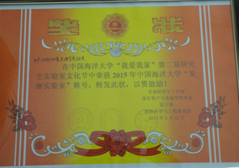 为了进一步提升学校师生实验室安全意识,共建安全、美丽、和谐实验室,2015年4月学校组织开展了中国海洋大学“我爱我家”第二届研究生实验室文化节。此次活动中,本研究室积极参与美丽实验室评选活动,由苏真真、张家顺、闻剑旻3位同学撰写材料,经学院推荐,主办方邀请评委对各学院推荐的“美丽实验室”进行评审,最终,本研究室被评选为2015年中国海洋大学十大“美丽实验室”。