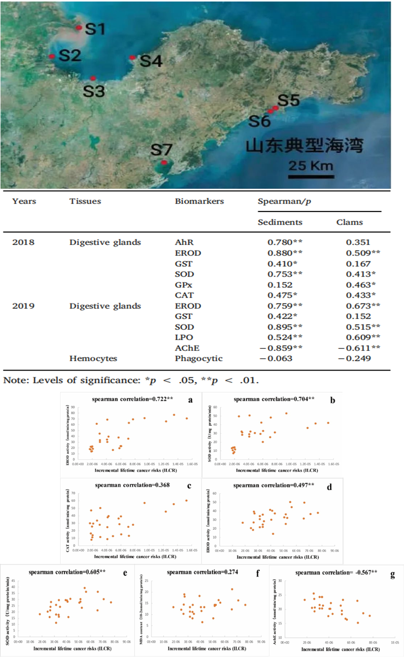 中国海洋大学海水养殖教育部重点实验室潘鲁青教授课题组分别于2018年、2019年3月、5月、8月、10月在山东典型海湾莱州湾(S1、S2、S3、S4)、乳山湾(S5、S6)、胶州湾(S7)进行了PAHs污染调查和生物监测研究。相关性分析表明,菲律宾蛤仔(Ruditapes philippinarum)消化盲囊7-乙氧基-异吩恶唑酮-脱乙基酶(EROD)和超氧化物歧化酶(SOD)活性可作为山东典型海湾PAHs污染评价的生物标志物,同时除2018年S2站点菲律宾蛤仔软体部PAHs含量的终生癌症风险(ILCR)为潜在风险水平(10−5)外,其它站点ILCR值均低于10−6,无致癌风险,而且各站点菲律宾蛤仔消化盲囊EROD、SOD和乙酰胆碱酯酶活性均与ILCR值呈显著相关性。