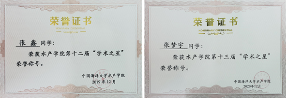 为表彰学习成绩优异、科研能力显著、发展潜力突出的研究生同学,水产学院于每年定期开展“学术之星”评选活动并分别评选3位“学术之星”。经层层选拔与答辩,研究室2017级水产养殖博士研究生张鑫、2019级水生生物学博士研究生张梦宇分别以优秀的表现和认真务实的科研态度斩获水产学院第十二届(2019年度)、第十三届(2020年度)“学术之星”荣誉。
