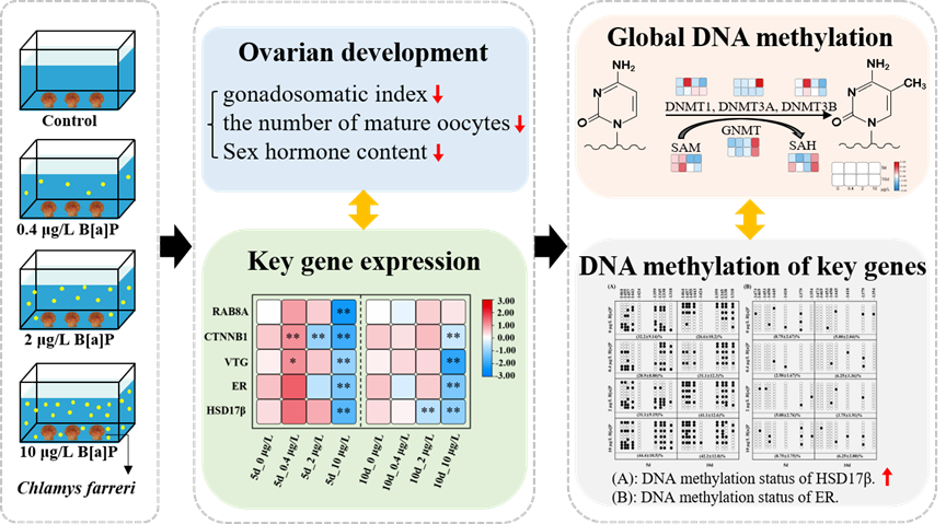 研究室在多环芳烃(PAHs)对双壳贝类生殖表观遗传毒性方面取得新进展,研究成果以“Study of DNA methylation of hsd17β, er and reproductive endocrine disrupting effects in female Chlamys farreri under benzo[a]pyrene stress”发表在环境科学与生态学Top期刊Environmental Pollution(中科院2区,IF=9.988)。
