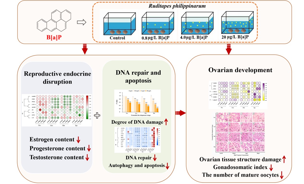 菲律宾蛤仔(Ruditapes philipinarum)是一种广温广盐性的经济贝类,主要分布于西太平洋、欧洲温带和我国南北沿岸等海区,作为海区埋栖生物群落的优势种,在食物网和生态循环中发挥重要作用,常被作为海洋POPs污染的指示生物。本文以菲律宾蛤仔为研究对象,通过设置0、0.8、4和20 μg/L典型PAHs--苯并芘(B[a]P)的染毒实验梯度,探究了(B[a]P对雌性菲律宾蛤生殖内分泌干扰途径、卵巢发育毒性、DNA损伤机制。结果表明,B[a]P通过干扰类固醇激素合成和雌激素信号通路,引起性激素含量和卵黄蛋白原基因表达下降,同时B[a]P染毒造成卵巢DNA损伤,而且DNA修复和细胞自噬、凋亡均被抑制;由此在B[a]P胁迫下卵巢细胞增殖、卵子发育和卵子排出受到抑制,性腺指数和卵母细胞数量下降,呈现出明显的时间-剂量效应,产生明显的生殖毒性效应。这项研究从生殖内分泌干扰和DNA损伤两个方面,阐明了PAHs对双壳贝类的生殖毒性机制,为海洋贝类种质资源保护和PAHs污染监测提供了科学依据。