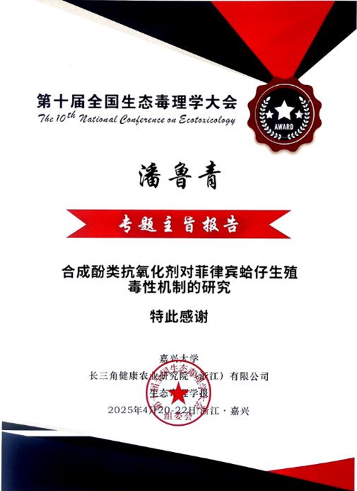 2025年4月20-22日“第十届全国生态毒理学大会”在浙江省嘉兴市隆重召开。本次盛会由嘉兴大学、长三角健康农业研究院(浙江)有限公司与生态毒理学报联合主办,汇聚了国内生态毒理学、环境毒理学、卫生毒理学等领域的权威专家、学者和青年科研工作者,围绕化学物质环境行为、毒理效应机制、生态健康风险评估等前沿议题展开深入研讨。研究室潘鲁青教授和苗晶晶副教授受邀在会议上作学术报告。