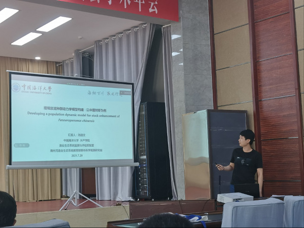 图3 博士生刘逸文进行《增殖放流种群动力学模型构建:以中国对虾为例》口头汇报