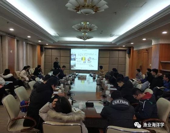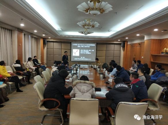 郭新宇教授为师生带了题为“日本海太平洋褶柔鱼的资源变动:原因、对策、预测”的报告,郭教授从日本海环境变化和太平洋褶柔鱼资源变动现状出发,结合环境数据与太平洋褶柔鱼生物学资料,通过开发的模型对其资源变动进行了研究,结果显示水温、流场及褶柔鱼亲体量等因素将会影响其资源量及分布,在此基础上,郭教授介绍了如何建立海洋保护区以应对资源的变动以及在地球暖化背景下对日本海太平洋褶柔鱼资源情况的预测研究;许永久博士进行了题为“生态类群角度下环境变化和捕捞压力对舟山近海鱼类群落的影响”的报告,许永久博士首先介绍了渔业遥感应用于水母检测的研究内容,通过结合环境因素及水母生活史特征研究影响水母爆发的关键因素,接下来,许博士围绕舟山渔场渔业生态系统,介绍了环境变化与捕捞压力的直接作用、交互作用对群落结构影响的研究内容。