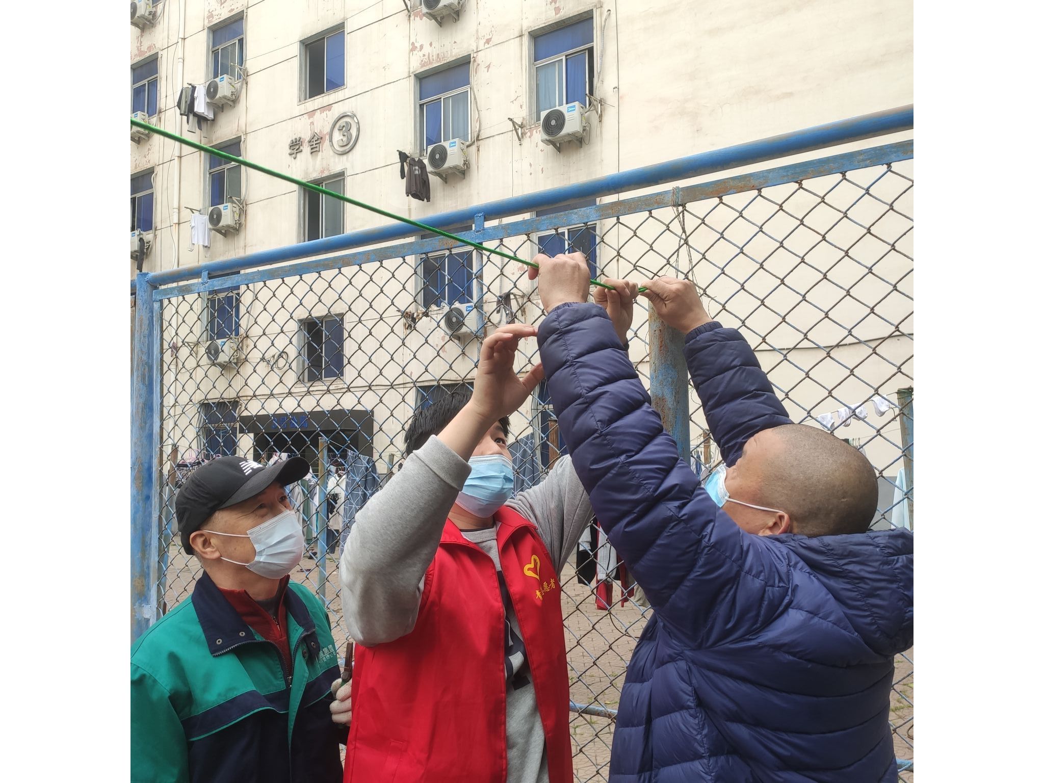 本科生第五党支部书记、成员在工作期间分工有序、热情帮忙,向电工师傅请教搭建方法,学会了做事要“能干+巧干”,他们将破损老旧的晾衣绳,安装的临时绳子拆下,换上统一美观的晾衣绳,可以更加牢固的晾晒衣物。
