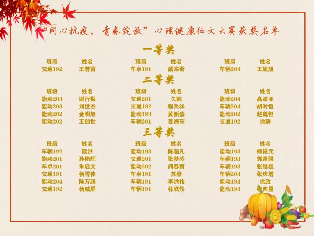 ,班级,姓名,联系方式。围绕抗疫内容以word文档的形式通过电子邮件的方式参与比赛。投稿作品获奖名单在二级心理辅导站官Q进行公布。心理健康部负责人共通过邮箱收集到征文100余篇。在评委反复细致的评选后评比出院一、二、三等奖并颁发奖品。