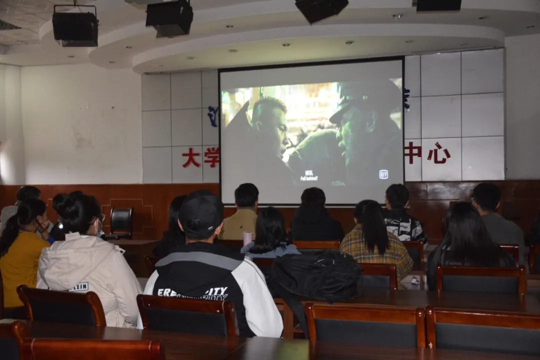 组织团学骨干们在6号楼101会议室观看《八佰》影片。团委兼职副书记冯阳、团委办公室主任冯浩楠组织同学就座。主持人康丙林负责活动的开展。