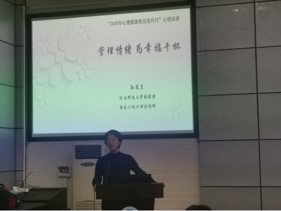 组织同学积极参加以“管理情绪,为幸福干杯”为主题的心理健康讲座,本次讲座是在开元校区公教3区学术报告厅举行,由国家二级心理咨询师孙夏兰副教授主讲。