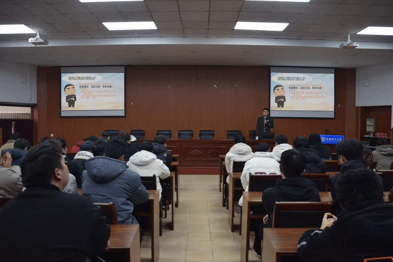李元枫从参军的意义、应征入伍的条件、参军享有政策三个方面进行了详细解读,让同学们对参军入伍的条件、流程等有了详细的了解。他号召同学们穿上军装,扛起钢枪,告别稚嫩与迷茫,奔赴山河与战场,在热血军旅中镌刻属于自己的荣耀篇章。
