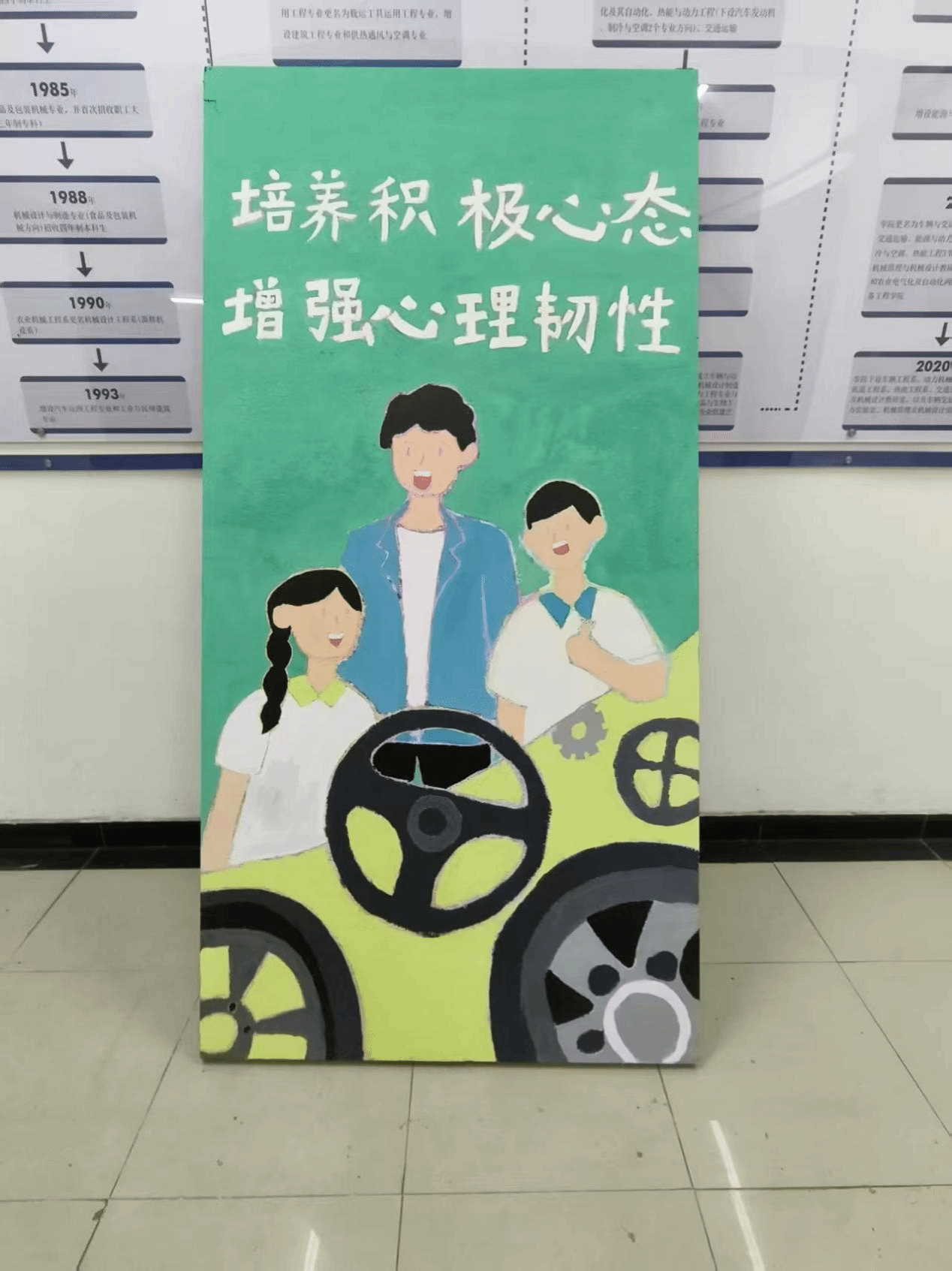 活动现场,一块设计独特的展板格外引人注目。展板以清新的绿色为底色,象征蓬勃生机;画面中巧妙融入汽车元素,寓意同学们在成长道路上稳步前行;三位面带笑容的同学形象生动,展现彼此陪伴、共同进步的积极状态。主题标语“培养积极心态 增强心理韧性”醒目而有力,点明活动主旨。