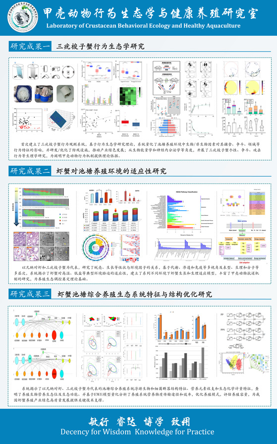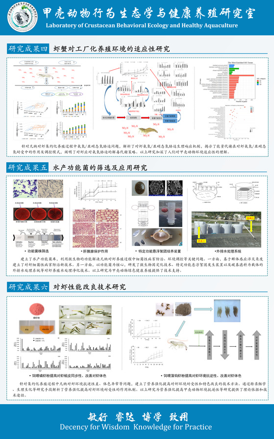 甲壳动物研究室始建于1982年,创始人为王克行教授,2020年更名为甲壳动物行为生态学与健康养殖研究室,隶属于中国海洋大学海水养殖教育部重点实验室,主要承担甲壳动物生理/行为/环境生态学和健康养殖模式与技术、水产功能菌益生机理及应用工艺的科研、教学及技术服务工作,在甲壳动物行为生态学、环境耐受机制、养殖生态系统结构与功能优化、水产功能菌益生机理等领域取得系列重要创新性成果。