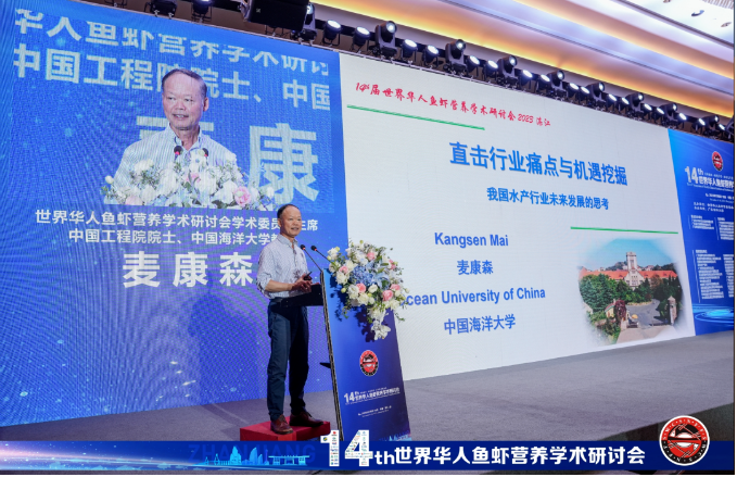 11月7日,世界华人鱼虾营养学术研讨会学术委员会主席、中国工程院院士、中国海洋大学教授麦康森在第十四届世界华人鱼虾营养学术研讨会上作《直击行业痛点与机遇挖掘,我国水产行业未来发展的思考》主题报告