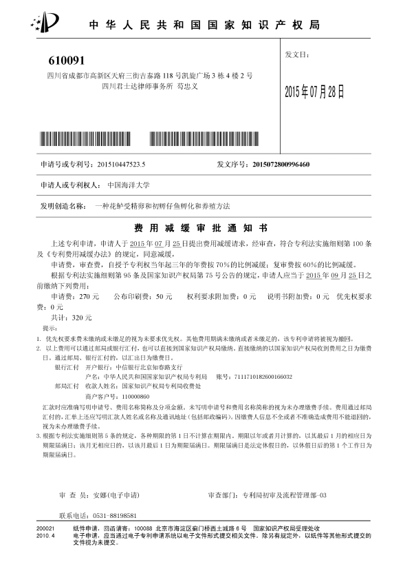 2、受理国家技术发明专利“一种花鲈受精卵和初孵仔鱼孵化和养殖方法”,受理号:201510447523.5,受理日期:2105年7月28日。发明人:温海深,黄杰斯,张美昭,李吉方,何峰。 3、受理国家技术发明专利“一种盐度驯化花鲈仔鱼的方法”,受理号:201510446077.6,受理日期:2015年7月28日。发明人:温海深,黄杰斯,张美昭,李吉方,何峰。