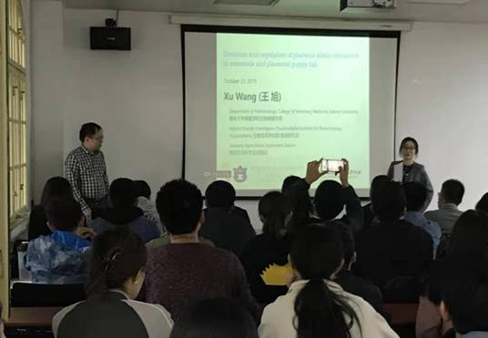 2019年10月22日上午9点30分,应鱼类繁殖生理与种子工程实验室邀请,王旭博士于铭史楼(原档案馆)二楼多媒体教室进行了题为哺乳动物和卵胎生孔雀鱼胎盘等位基因失衡的进化与调控的学术报告,报告由李昀老师主持。在报告结束后王旭博士对到场师生提出的关于表观遗传学、胚胎发育方面的问题进行了详细的解答,大家收获颇丰。 主讲人王旭博士,2004年毕业于复旦大学生命科学院,师从中国科学院院士金力教授,主修生物科学和群体遗传学,获学士学位。2005年赴美国康奈尔大学分子生物学与遗传学系,师从美国科学院院士Dr.Andrew Clark,并于2011年获得该校遗传学与基因组学专业博士学位,并辅修生物统计学和计算生物学。现任美国奥本大学兽医学院生物病理学系和阿拉巴马州农业试验站助理教授,HudsonAlpha生物技术研究院客座研究员。主要研究方向:表观遗传学、比较基因组学、功能基因组学、进化基因组学和肠道宏基因组学。目前以第一作者及通讯作者在PLoS Biology, PNAS, Genome Research, PLoS Genetics, Genome Biology, Genetics, Heredity 等国际知名期刊发表多篇文章。