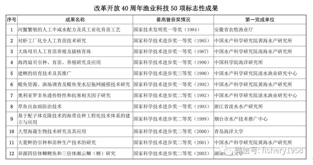 为隆重纪念中国改革开放40周年,全面回顾改革开放40年渔业科技发展历程和辉煌成就,弘扬和宣传一批为渔业产业发展做出突出贡献的科技成果和先进人物,中国水产学会和中国渔业协会联合组织开展了改革开放40周年渔业重大科技成果与突出贡献人物遴选推介活动。经过单位推荐、专家提名、征求意见、专家审议等程序,共遴选出改革开放40周年渔业科技突出贡献人物20名和渔业科技纪念人物24名,渔业科技标志性成果50项。 渔业科技突出贡献人物名单(20名)