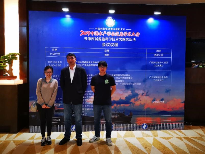 11月13日,2019年中国水产学会范蠡学术大会暨第四届范蠡科学技术奖颁奖活动在南宁举行,大会学术交流采取“1+8”的形式,即1个主会场,8个专题分会场。主会场报告中,行业专家分别作题为《加快推进渔业高质量发展》、《2016-2019水产学学科发展研究报告》、《中国水产营养饲料研究进展与展望》、《遗传育种生物技术创新驱动水产养殖可持续绿色发展》主旨报告。专题分会场中,与会者分别就绿色水产养殖新技术、水产生物技术与育种、渔业资源与生态保护、现代渔业设施装备、疫病防控与质量安全、水产品加工与综合利用、休闲渔业与渔文化等内容开展学术交流。本实验室温海深、李昀、齐鑫参加会议。