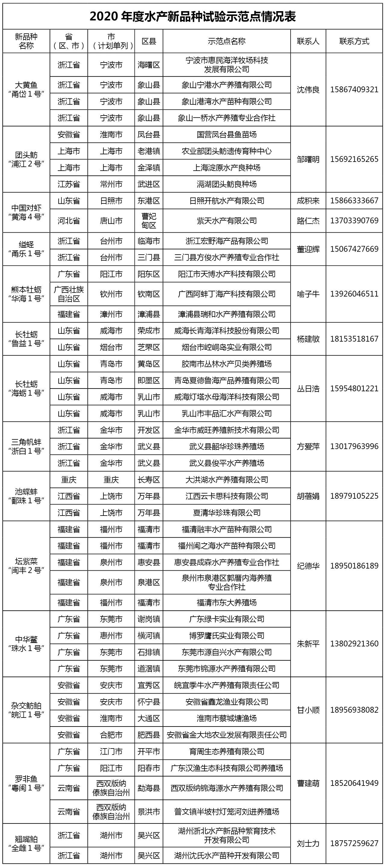附件1 2020年度水产新品种试验示范点情况表
