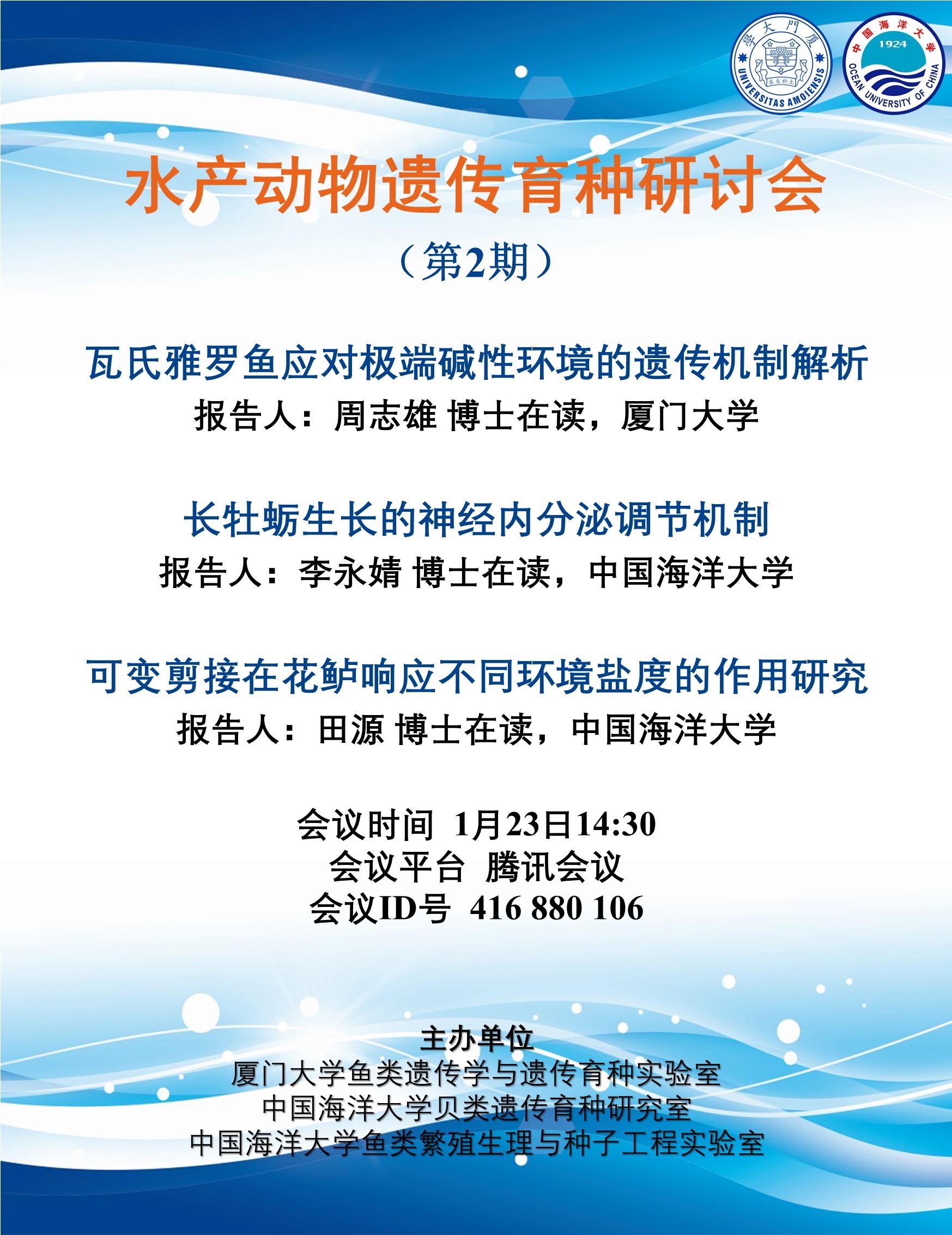 水产动物遗传育种研讨会是由厦门大学鱼类遗传学与遗传育种实验室、中国海洋大学贝类遗传育种研究室、中国海洋大学鱼类繁殖生理与种子工程实验室共同发起、组织的学术研讨会。