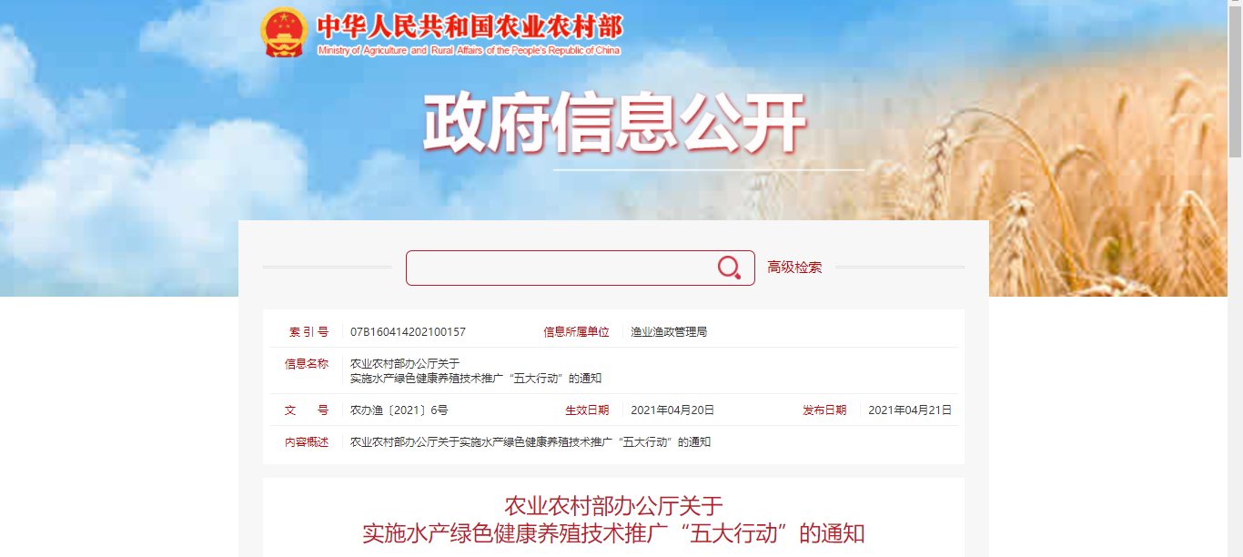 进一步贯彻落实党的十九届五中全会关于推动绿色发展、加快发展方式转型升级的战略部署和2021年中央一号文件推进水产绿色健康养殖的部署要求,420日,农业农村部办公厅印发《关于实施水产绿色健康养殖技术推广五大行动的通知》(农办渔〔20216号),决定在十四五期间进一步实施生态健康养殖模式示范推广、养殖尾水治理模式推广、水产养殖用药减量、配合饲料替代幼杂鱼和水产种业质量提升等水产绿色健康养殖技术推广五大行动(以下简称五大行动),并对该项工作进行了部署,明确由全国水产技术推广总站负责牵头组织五大行动实施工作。