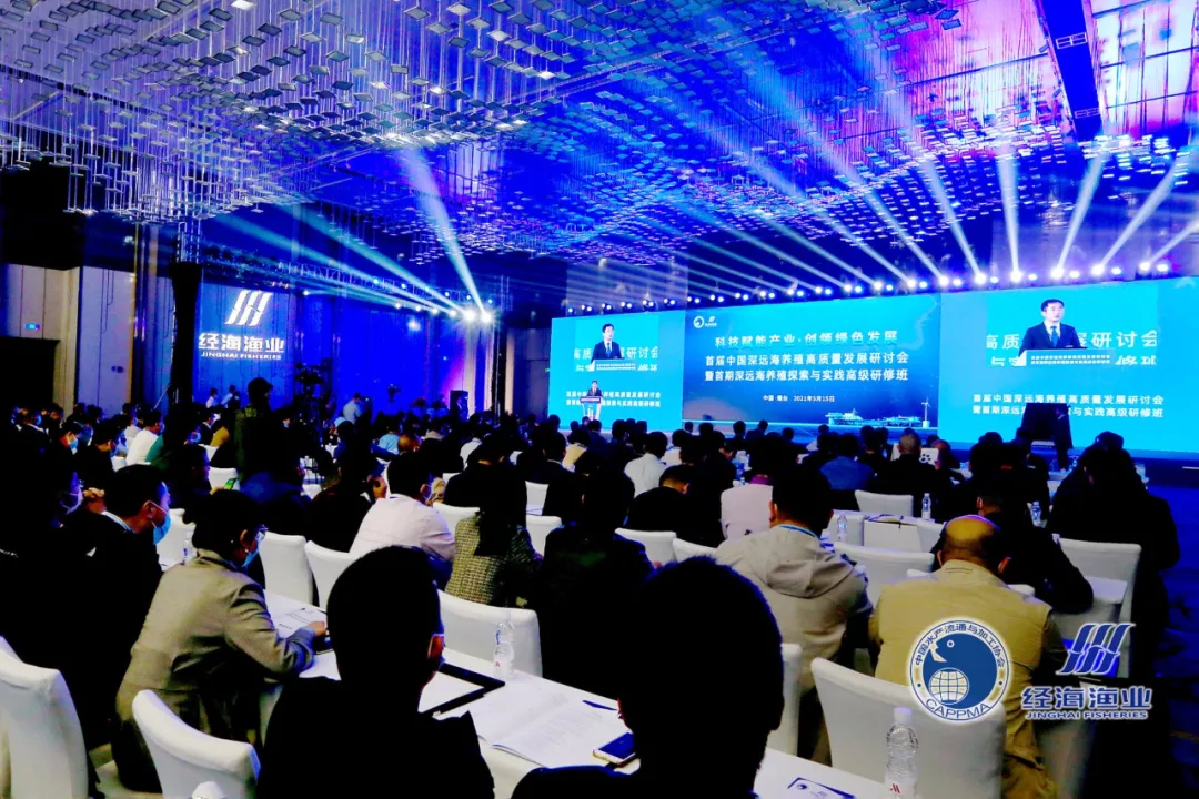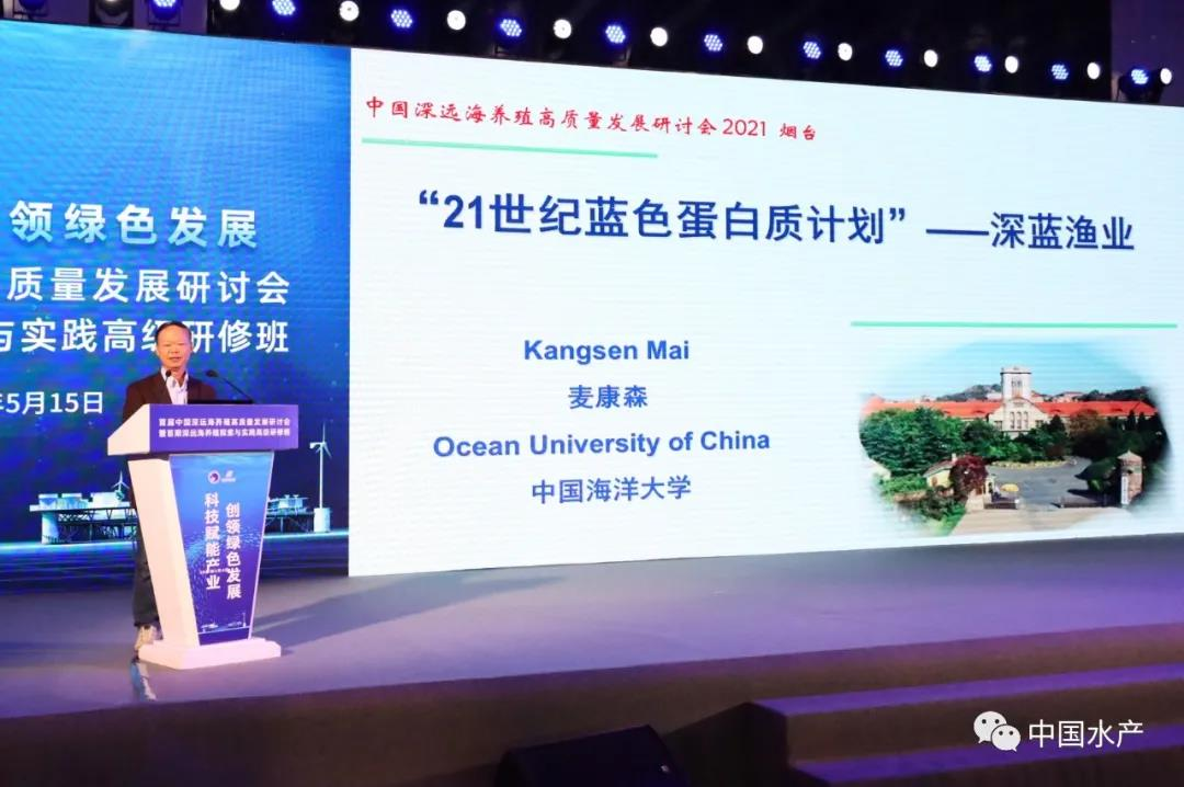 首届中国深远海养殖高质量发展研讨会现场 2021年5月14-16日,“首届中国深远海养殖高质量发展研讨会暨首期深远海养殖探索与实践高级研修班”在山东省烟台市举办。研讨会以“科技赋能产业·创领绿色发展”为主题,旨在践行新发展理念,坚持高质量发展,以实施乡村振兴战略为引领,以满足人民对优质水产品和优美水域生态环境的需求为目标,探索深远海绿色养殖模式,建设深远海大型智能化养殖渔场。 研讨会由中国水产流通与加工协会、烟台市人民政府主办,烟台经海海洋渔业有限公司承办,中国海洋大学发起成立的中国新农科水产联盟作为技术支持单位之一。农业农村部渔业渔政管理局一级巡视员李书民,中国水产科学研究院副院长邓伟,中国工程院院士、中国海洋大学教授麦康森,中国工程院院士、国家海洋腐蚀防护工程技术研究中心主任侯保荣,挪威技术科学院院士、上海交通大学特聘教授、船舶与海洋工程专家付世晓,山东省农业农村厅党组成员、副厅长王敬东,烟台市副市长牟树青,中国水产流通与加工协会会长崔和等在大会上讲话或做主题报告,来自全国10余省市的240余人出席活动。 麦康森院士就发展深远海水产养殖的重要性作专题报告,指出发展深蓝渔业是“21世纪蓝色蛋白质计划”的基石,未来水产养殖的空间在海洋、在循环水设施化养殖。因为深蓝渔业是人类食物安全供给不可或缺的组成部分;水产品是改善国民膳食结构,保障人民身体健康的重要物质;水产养殖饲料较之畜禽养殖更节约粮食,更保护环境;保护日益枯竭的野生渔业资源,必须限制捕捞,发展深远海养殖。此外,深远海水产养殖既可维护海洋国土安全,创造和平崛起的环境,又能摆脱淡水水域和陆地空间的限制,符合美丽中国建设的要求。10年前麦康森院士提出我国深远海养殖的战略目标是:以东海、南海深远海养殖为重点,开展关键技术与重大装备研发,构建“养一捕一加”相结合、“海一岛一陆”相连接的全产业链深远海养殖体系,国家战略性投入,引入多方资本,建立企业平台,形成全产业链新模式。用10年~20年时间,建成一批深远海大型养殖平台,形成海上工业化养殖生产群,为解决人类优质海洋蛋白质来源贡献中国方案。