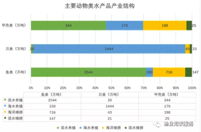 中国渔业主要有水产养殖业、捕捞业、加工业、增殖业和休闲渔业5大产业形态,水产品的产量主要来自养殖和捕捞。图1所示为中国水产养殖与捕捞产业主要构成。