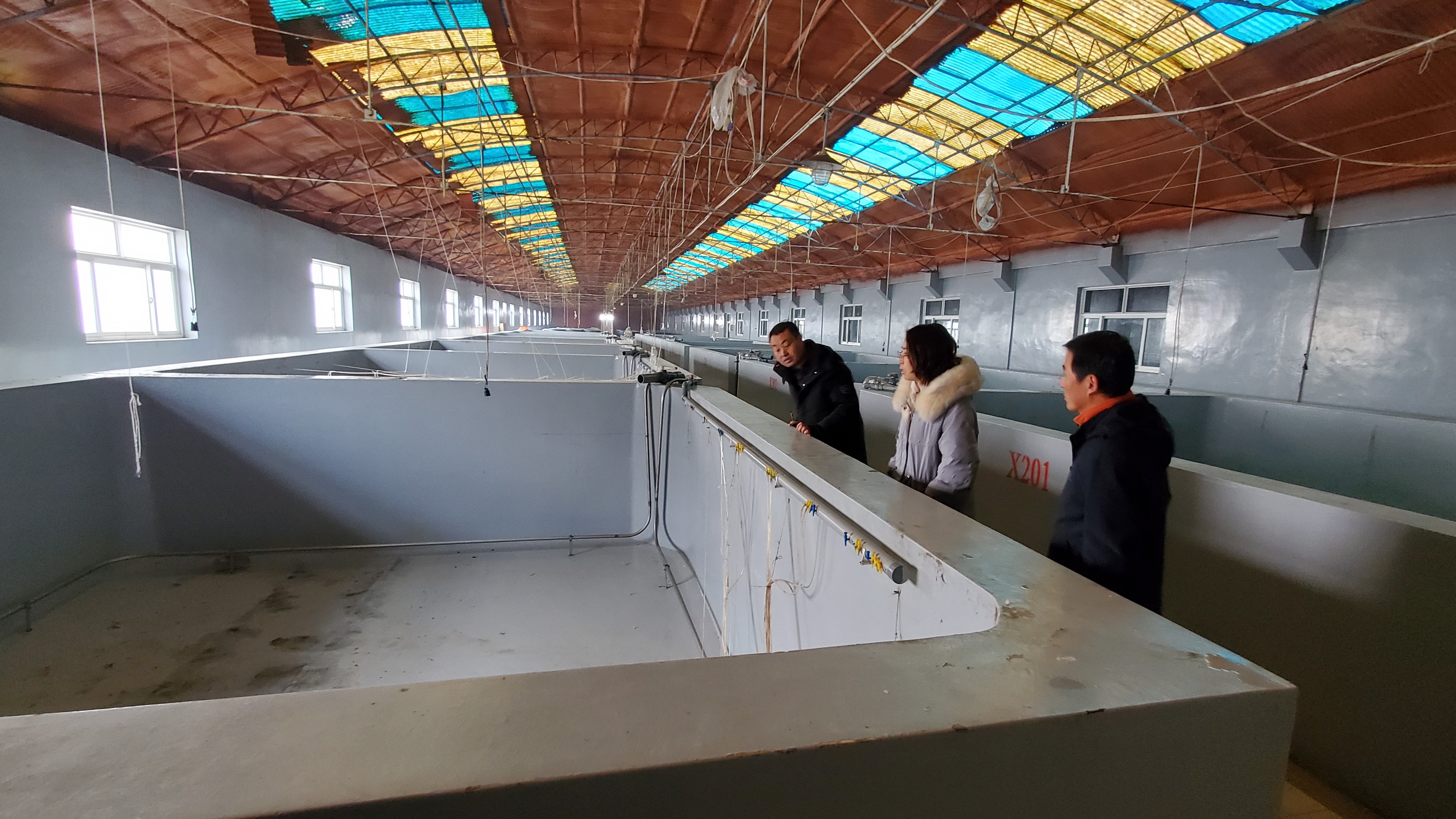 会后,张经理带大家对中捷公司进行了参观。目前,罗非鱼在塑料温棚养殖,养殖水温约24℃,共有塑料温棚30座;半滑舌鳎在循环水车间养殖,共3个循环水车间,6套循环水系统,66个室内水泥池,养殖面积为4000平方米;中捷公司中水产总站的2个车间为流水车间,共4排池子,目前主要是做增殖放流项目用。