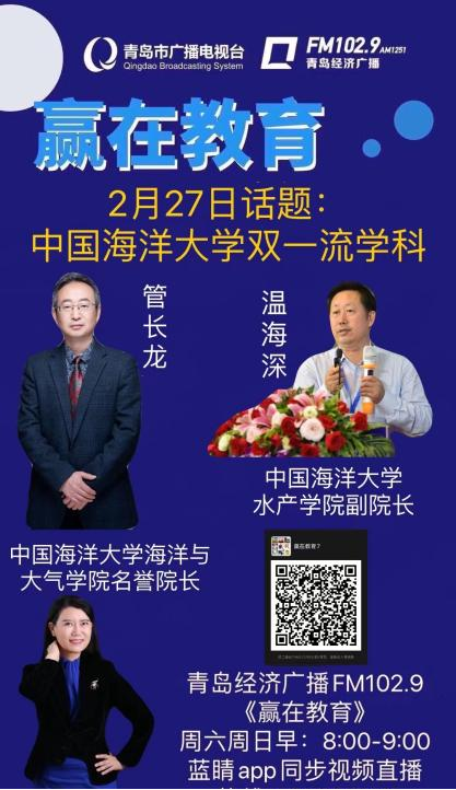 2022227日上午,中国海洋大学招生办公室,邀请水产学院副院长温海深教授出席青岛经济广播《赢在教育》栏目,他立足国家双一流学科,针对水产类专业的本科教育工作接受了采访。