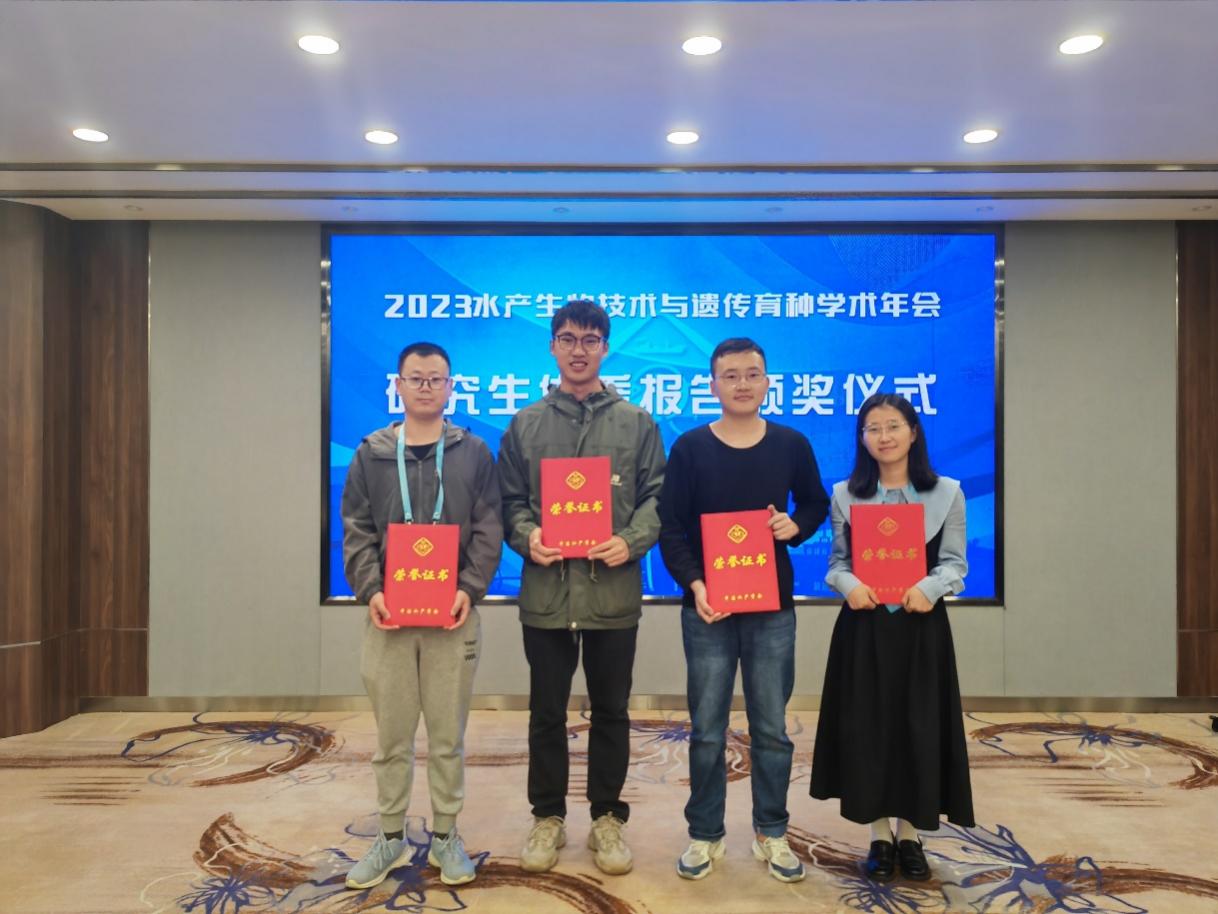霭霭四月,齐聚港城。4月22-23日,2023水产生物技术与遗传育种学术年会在广东湛江举行。此次年会以“生物技术创新赋能水产种业高质量发展”为主题,由中国水产学会主办,中国水产学会水产生物技术与遗传育种专业委员会、广东海洋大学、广东省水产动物病害防控与健康养殖重点实验室、南方海洋科学与工程广东省实验室(湛江)承办。中国科学院院士、中国科学院水生生物研究所桂建芳教授,中国工程院院士、中国海洋大学包振民教授,中国工程院院士、湖南师范大学刘少军教授,中国工程院院士、中国水产科学研究院黄海水产研究所陈松林研究员以及来自全国多个科研院所、高校和企业的遗传育种领域专家、学者近600人齐聚一堂,就水产育种技术和水产种业进行深入交流,探讨新方法,交流新成果,为提升我国育种技术水平,促进我国水产种业健康发展贡献智慧力量。本实验室温海深教授带领博士研究生孙冬磊、张冲,硕士研究生李广玲和王浩出席,并在研究生论坛中做大会报告。温海深教授以《我国花鲈种业发展思考》为题,分享了我国花鲈养殖的产业现状、繁育技术以及培育模式,并对花鲈遗传改良研究工作的成效进行了汇报。本实验室研究生报告题目: 1. 张冲博士研究生:花鲈(Lateolabrax maculatus)生长性状的全基因组关联分析和基因组预测。 2. 李广玲硕士研究生:低氧胁迫下牙鲆(Paralichthys olivaceus)鳃组织细胞凋亡机制及转录组与甲基化联合分析。 3. 王浩硕士研究生:牙鲆(Paralichthys olivaceus)骨骼肌肌发育相关 circRNA 筛选及其调控机制研究。 本实验室博士研究生张冲、硕士研究生李广玲、王浩荣获研究生优秀报告奖。