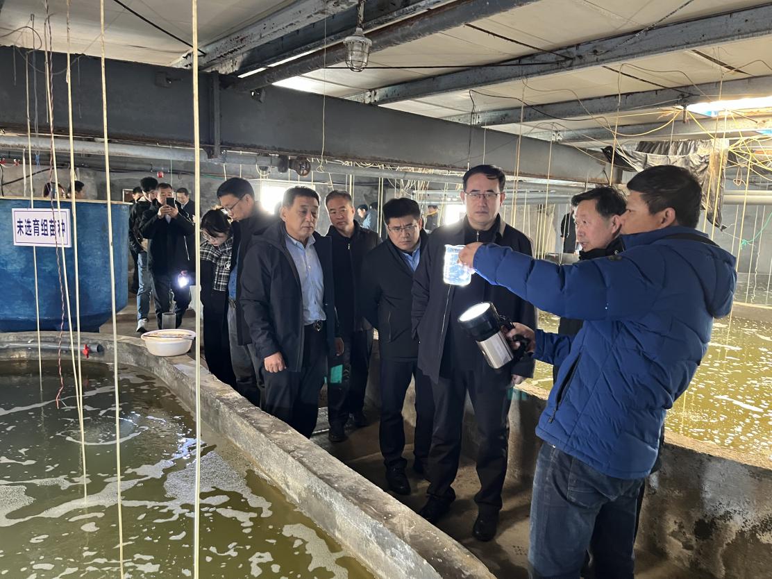 活动现场 黄学东副局长、张光军副县长等陪同张猛书记和温海深副院长一行首先来到利津双瀛水产苗种有限公司,参观花鲈亲鱼养殖车间和花鲈苗种培育车间,着重调研了花鲈亲鱼选育情况和2023年苗种生产情况。双瀛苗种公司与中国海洋大学鱼类繁殖生理与种子工程实验室合作已有12年,在学院的科技助力下,公司现已经形成每年2100万尾的花鲈育苗规模,成为我国北方最大的花鲈工厂化人工繁育基地,获得“利津鲈鱼”国家地理标志产品,荣获“国家高新技术企业”“利津花鲈省级良种场”“山东省重点龙头企业”等称号。