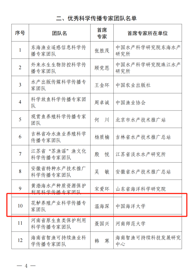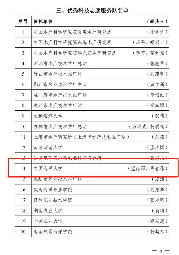 近日,中国水产学会公布了2024年度科普和科技志愿服务工作优秀名单,由本实验室温海深教授任首席专家组成的“花鲈养殖产业科学传播专家团队”获评“优秀科学传播专家团队”,依托中国海洋大学建设的科技志愿服务队被评为“优秀科技志愿服务队”(牵头人温海深、毕春伟)。