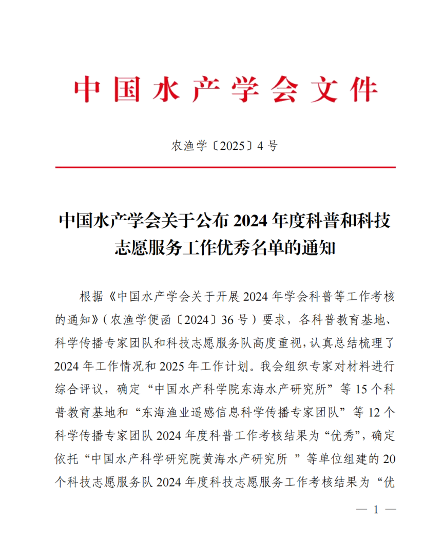 我实验室入选中国水产学会科普和科技志愿服务工作优秀名单